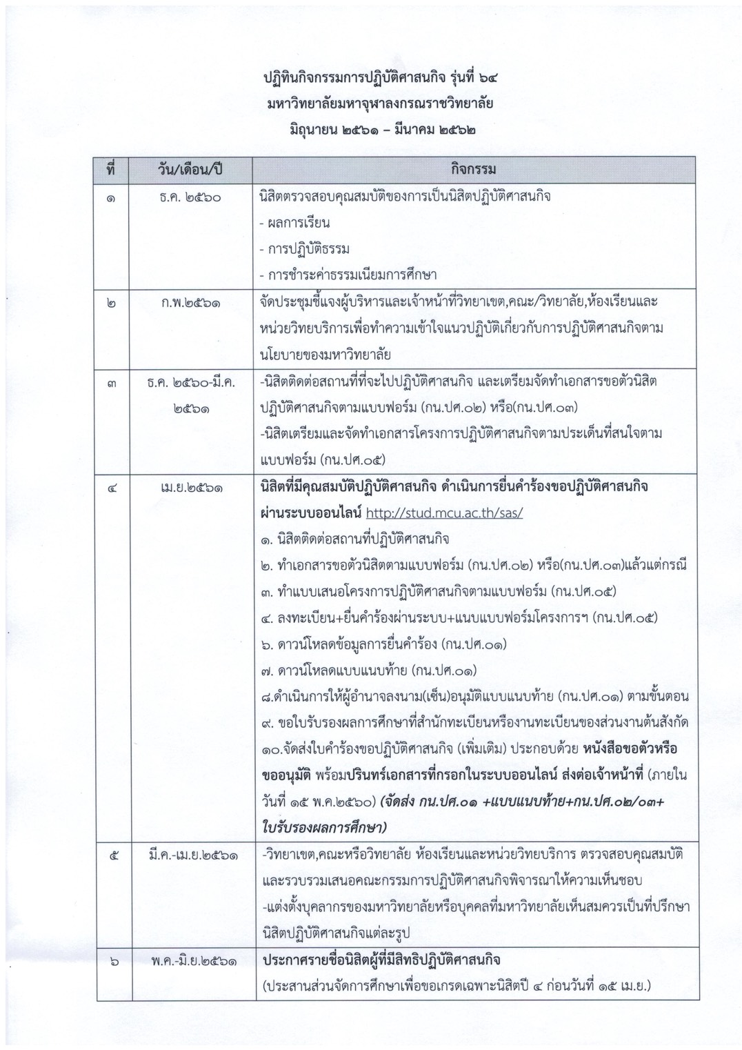 แจ้งนิสิตปฏิบัติศาสนกิจ รุ่นที่ ๖๔