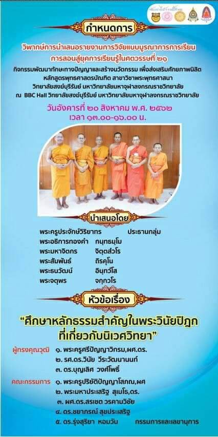 หลักสูตรพุทธศาสตรบัณฑิต สาขาวิชาพระพุทธศาสนา วิทยาลัยสงฆ์บุรีรัมย์ ขอนิมนต์/เรียนเชิญ ผู้บริหาร คณาจารย์ เจ้าหน้าที่ นิสิต และศิษย์เก่าวิทยาลัยสงฆ์บุรีรัมย์ รวมทั้งผู้สนใจทุกท่าน ➡️ร่วมงานเสวนาทางวิชาการ "พุทธธรรมกับสิ่งแวดล้อม" ในวัน อังคาร ที่ ๒๐ สิงหาคม พ.ศ.๒๕๖๒ ณ วิทยาลัยสงฆ์บุรีรัมย์ มหาวิทยาลัยมหาจุฬาลงกรณราชวิทยาลัย โดย พระครูศรีปัญญาวิกรม ผศ.ดร.ประธานหลักสูตรสาขาวิชาพระพุทธศาสนา วิทยาลัยสงฆ์บุรีรัมย์ มจร. รศ.ดร.วินัย วีระวัฒนานนท์ นายกสมาคมสิ่งแวดล้อมแห่งประเทศไทย ดร.บุญเลิศ วงศ์โพธิ์ อาจารย์ประจำหลักสูตรสิ่งแวดล้อมศึกษา มหาวิทยาลัยปทุมธานี ผศ.ดร.ทค.ณัฐพงศ์ธัช กุรัตน์ธรรมา อาจารย์ประจำวิชามนุษย์กับสิ่งแวดล้อม วิทยาลัยสงฆ์บุรีรัมย์ มจร. ➡️และร่วมวิพากษ์การนำเสนอรายงานวิจัยแบบบูรณาการกับการเรียนการสอนสู่ยุคการเรียนรู้ในทศวรรษที่ ๒๑ เรื่องศึกษาหลักธรรมสำคัญในพระไตรปิฎกที่เกี่ยวกับนิเวศวิทยา โดย นิสิตผู้ศึกษารายวิชาพระพุทธศาสนากับนิเวศวิทยา หลักสูตรพระพุทธศาสบัณฑิต สาขาวิชาพระพุทธศาสนาวิทยาลัยสงฆ์บุรีรัมย์ มจร. ดร.ปิยวัฒน์ คงทรัพย์ อาจารย์ประจำวิชาพระพุทธศาสนากับนิเวศวิทยา |