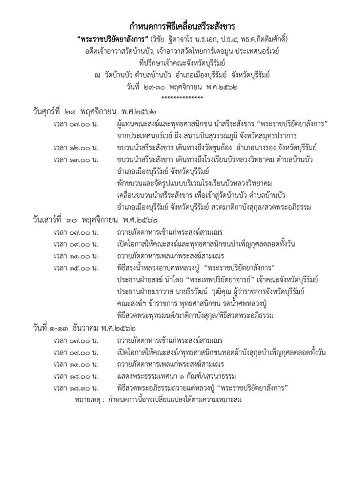 #แจ้งกำหนดการพิธีเคลื่อนสรีระสังขาร “พระราชปริยัตยาลังการ” (วิชัย ฐิตาจาโร น.ธ.เอก, ป.ธ.๔, พธ.ด.กิตติมศักดิ์) อดีตเจ้าอาวาสวัดบ้านบัว, เจ้าอาวาสวัดไทยการ์เดอมูน ประเทศนอร์เวย์ ที่ปรึกษาเจ้าคณะจังหวัดบุรีรัมย์ ในวันที่ ๒๙-๓๐ พฤศจิกายน พ.ศ.๒๕๖๒ ................................................................. #และกำหนดการพิธีพระราชทานเพลิงศพ “พระราชปริยัตยาลังการ” (วิชัย ฐิตาจาโร น.ธ.เอก, ป.ธ.๔, พธ.ด.กิตติมศักดิ์) อดีตเจ้าอาวาสวัดบ้านบัว, เจ้าอาวาสวัดไทยการ์เดอมูน ประเทศนอร์เวย์ ในที่ปรึกษาเจ้าคณะจังหวัดบุรีรัมย์ วันที่ ๑๔-๑๕ ธันวาคม พ.ศ. ๒๕๖๒ ณ วัดบ้านบัว ตำบลบ้านบัว อำเภอเมืองบุรีรัมย์ จังหวัดบุรีรัมย์ |