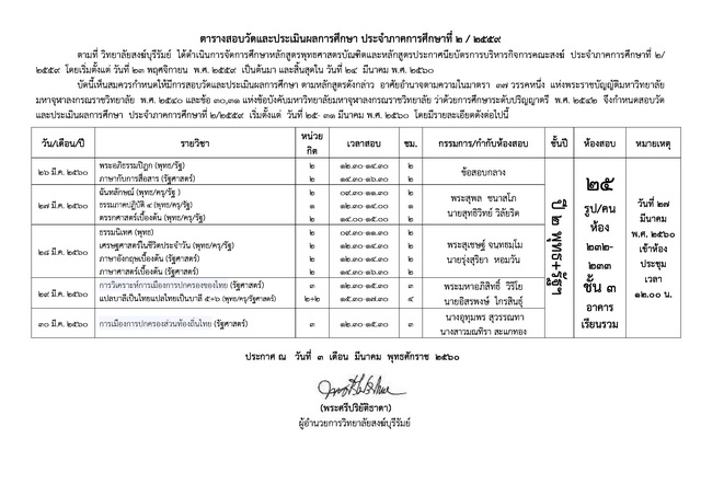 ตารางสอบและประเมินผลการศึกษา วิทยาลัยสงฆ์บุรีรัมย์ ประจำภาคการศึกษาที่