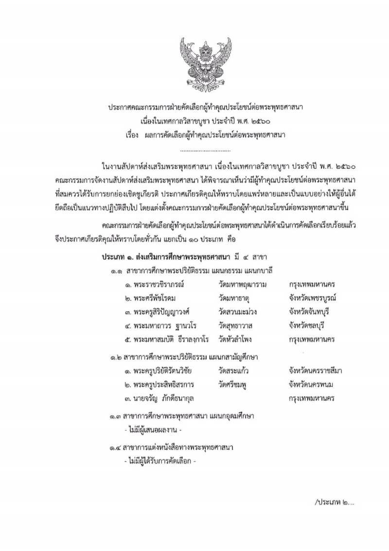 ผลการคัดเลือกผู้ทำคุณประโยชน์แก่พระพุทธศาสนา
